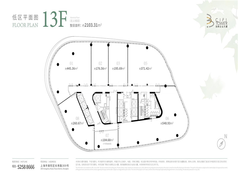旭辉企业大厦(CIFI TOWER)上海市普陀区长寿路309号,地处上海长寿路商业核心区,位于内环内,属内环核心区域。地铁2站直达静安寺商圈,7/13号线地铁上盖项目由高层优质办公及精品商业裙房构成,总建筑面积约79860.54平方米,商业面积近2万方。标准楼层面积约2000㎡、净高约2.95米。